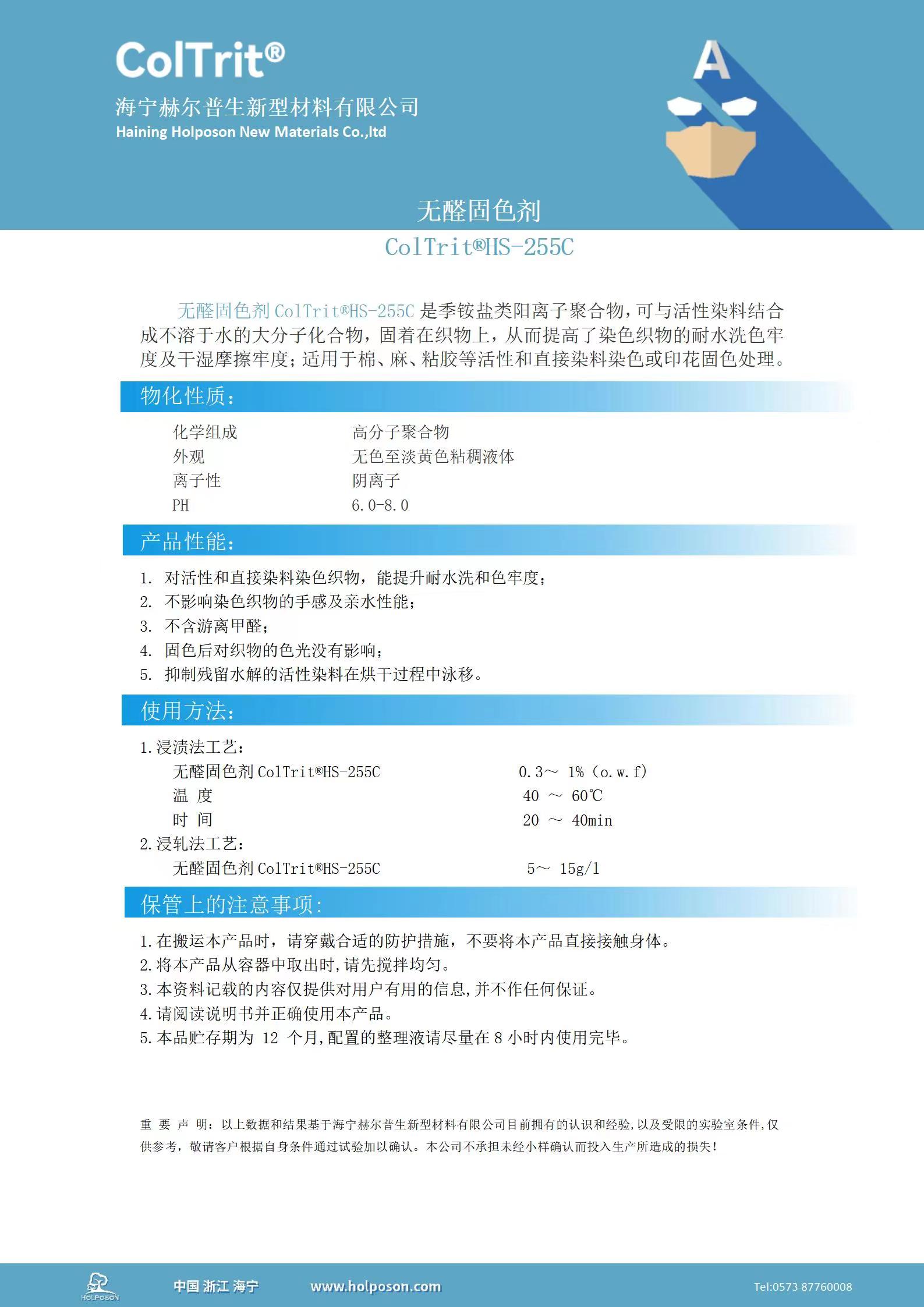 無(wú)醛 固色劑 ColTrit® HS-255C是季銨鹽 類陽(yáng)離子聚合物,可與活性染料結(jié)合成不溶于水的大分子化合物,固著在織物上,從而提高了染色織物的耐水洗色牢度及干濕摩擦牢度;適用于棉、麻 、粘膠等活性和直接染料染色或印花固色處理。