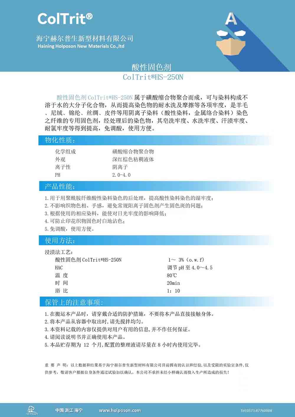 酸 性固色劑 ColTrit®HS-250N屬于磺酸 縮合物聚合而成,可與染料構成不溶于水的大分子化合物,從而提高染色物的耐水洗及摩擦等各項牢度,是羊毛﹑尼絨﹑錦綸﹑絲綢﹑皮件等用陰離子染料(酸 性染料,金屬絡合染料)染色之纖維的專用固色劑 ,經處理后的染色物,其皂洗牢度、水洗牢度、汗?jié)n牢度、耐氯 牢度等得到極大提高,免調酸 ,使用方便。