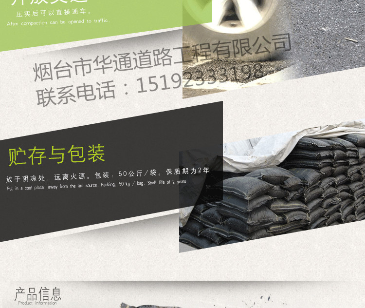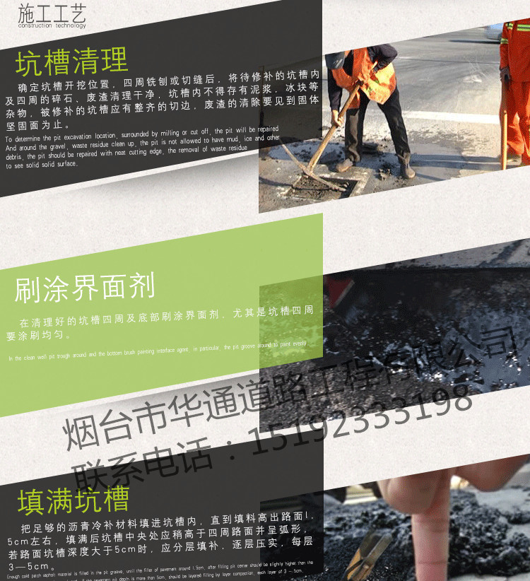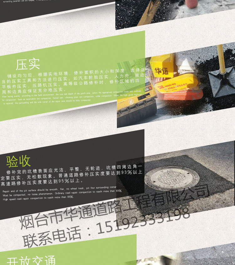 “華通瀝青冷補料”是一種高科技道路修補材料,核心材料源自美國進口,性質(zhì)穩(wěn)定,粘度大,可以在-。4. 壓實 鋪設(shè)均勻后,根據(jù)實地環(huán)境,修補面積的大小和深度,選擇適當?shù)膲簩嵐ぞ吆头椒ㄟM行壓實。如汽車輪胎壓實、人力夯、振動平板夯壓實、壓路機壓實。高等級公路修補時,修補區(qū)域的四周和邊角應(yīng)保證充分地壓實。5、開放交通 壓實后可以直接通車。
