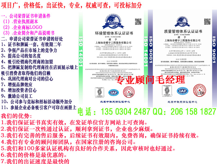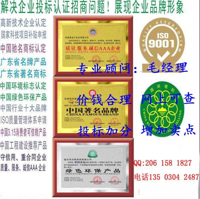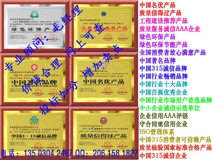 項目廣,價格低,出證快,專業(yè),權威可查,可投標加分本公司專業(yè)辦理企業(yè)榮譽證書,,中國著名品牌、全國行業(yè)十大品牌、綠色環(huán)保產品、中國名優(yōu)產品、質量信得過產品、質量.服務.誠信aaa企業(yè)、全國消費者放心滿意品牌、iso認證、中小企業(yè)誠信示范單位,十環(huán)標志、省名牌產品、省著名商標、中國馳名商標等證書。咨詢熱線:135 0304 2487 qq:206 158 1827 專業(yè)申請企業(yè)榮譽資質證書、辦理可提高企業(yè)形象、品牌知名度提升、產品銷售額加倍,增加經銷商代理商對企業(yè)的信心,解決企業(yè)投標問題!企業(yè)發(fā)展離不開榮譽的扶持,針對企業(yè)形象做宣傳、針對品牌知名度做、針對產品銷量而做推廣企業(yè)的榮譽為公司添彩,更能吸引消費者的眼球,千萬別忽視了這點小細節(jié)。 一個企業(yè)無論規(guī)模大小、都需要申請辦理一些證書、一些認證、一些榮譽等基本的資質證書!企業(yè)參加工程競標必備的資質和材料,附帶投標上能加分,增加中標的幾率.企業(yè)發(fā)展離不開榮譽的扶持,本機構可以為企業(yè)申請大部分的榮譽證書,給我們一個希望,還企業(yè)一份滿意。 一、企業(yè)榮譽證書的好處以及說明1.【在公司參與競標和招標活動中會得額外加分、參展會企業(yè)必備,吸引客戶,可印在畫冊上面宣傳】2.【爭搶產品在市場上的競爭力、提高公司和品牌的知名度】3.【吸引經銷商代理商的加盟、鞏固代理商對公司的信息】4.【把牌匾復制給代理商掛在店面展示墻上吸引消費者取得他們的信賴】5.【增強品牌效應、增加投資者的信心、激勵公司員工】6.【爭搶產品在市場上的競爭力,提高公司和品牌的知名度,吸引客戶】7.【證書和牌匾一套,有限期兩年《時間長》】