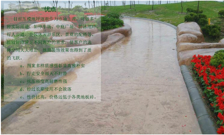 上海九路景觀工程有限公司供應:壓花地坪,壓模地坪,水泥壓花,水泥壓膜,壓膜水泥,混凝土壓花,混凝土壓模,壓花地面,壓花路面,壓花道路,壓花水泥,壓花混凝土,壓模地面,壓模路面,壓模道路,壓模水泥,壓;炷,壓印地坪,壓印混凝土,水泥壓印,壓印水泥,藝術地坪,彩色混凝土,裝飾混凝土,仿石地坪,仿木地坪,仿木地面,仿木路面,仿木混凝土,混凝土仿木,仿石地面,仿石混凝土,混凝土仿石,模壓地坪,模壓混凝土,模壓路面,彩色水泥,仿石壓模地坪,壓模仿石地坪,透水地坪,透水地面,透水路面,透水道路,透水混凝土,無砂混凝土,彩色地坪,彩色地面,彩色路面,彩色道路,藝術彩坪,壓磨地坪,歡迎垂詢!