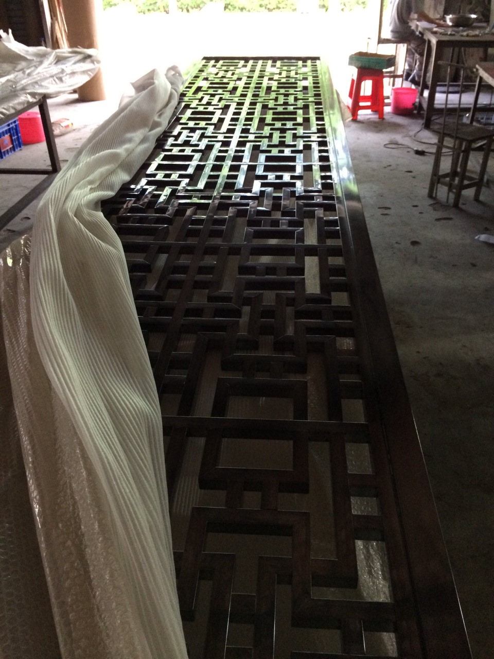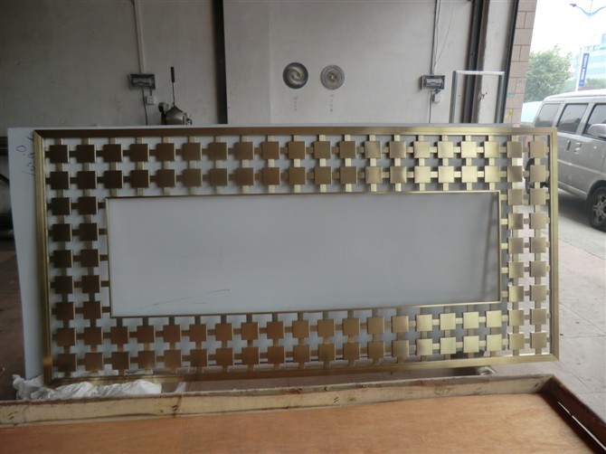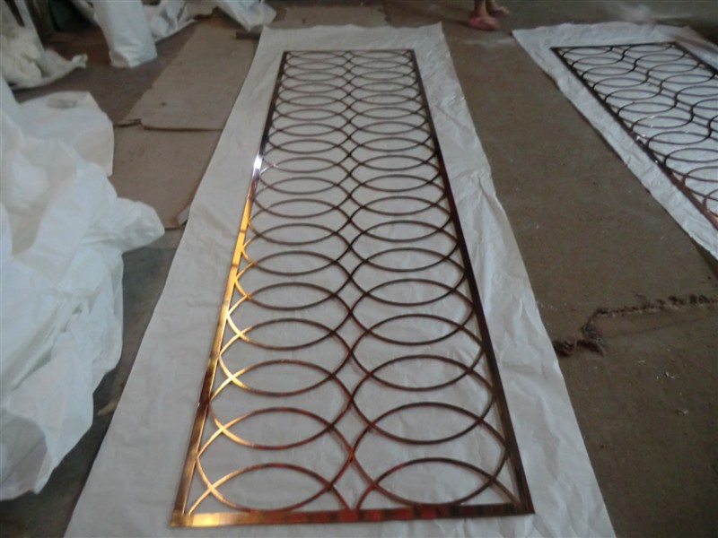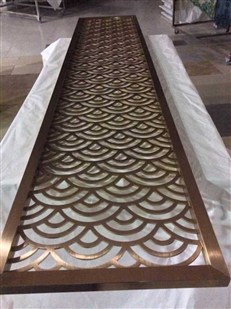經(jīng)過表面處理后,真空電鍍上色,然后激光鏤空屏風(fēng).