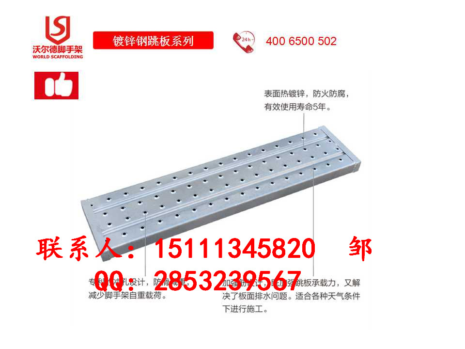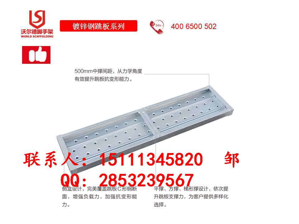 防滑性更好,每張鋼跳板上面都有防滑設(shè)計,木跳板和竹跳板是無法做防滑處理的;