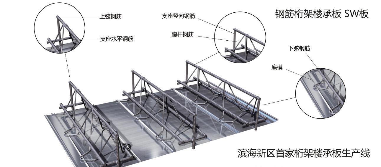 鋼筋桁架樓承板由上弦鋼筋、下弦鋼筋、腹桿鋼筋、底模、支座鋼筋構(gòu)成。