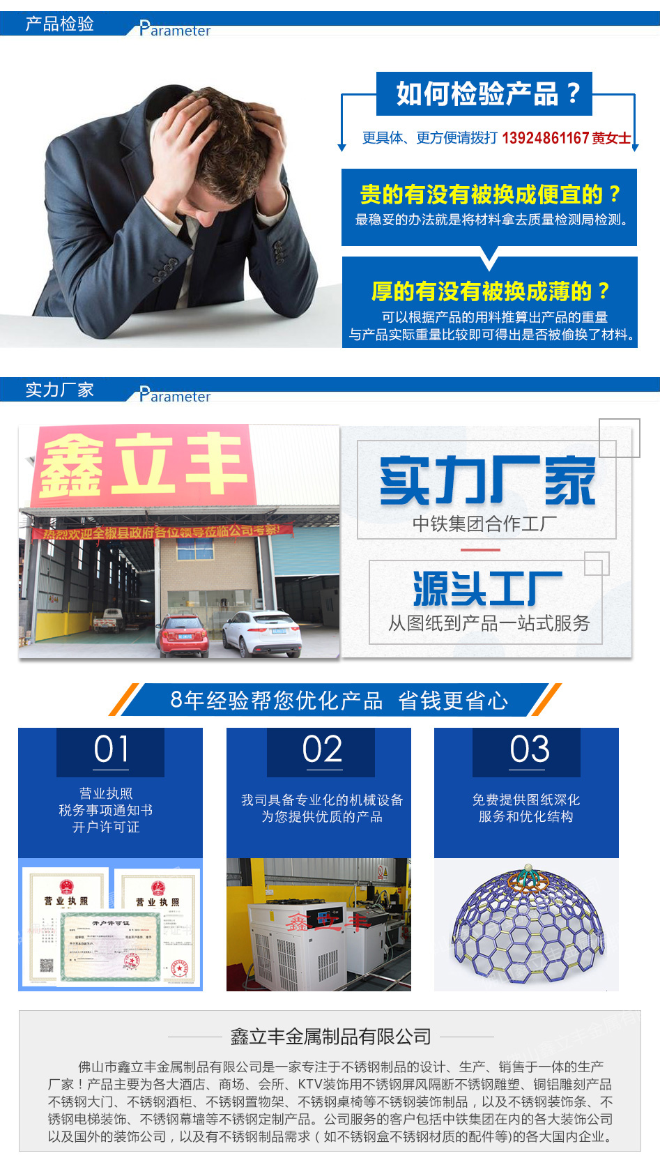 佛 山市鑫立豐金屬制品有限公司承接:不銹鋼屏風(fēng);不銹鋼酒柜/酒架;不銹鋼門套/門框;不銹鋼拉手/扶手/立柱;不銹鋼門;不銹鋼踢腳線;不銹鋼裝飾板等不銹鋼裝飾工程(不銹鋼工程裝飾材料供應(yīng))。公司生產(chǎn)不銹鋼工程裝飾制品、不銹鋼工程裝飾屏風(fēng)、不銹鋼花紋摟空裝飾品、不銹鋼高檔酒架、不銹鋼工程裝飾異形件、不銹鋼奢華拉手、不銹鋼電鍍展示架、不銹鋼電鍍工程門套、大門、不銹鋼金屬標(biāo)識(shí)標(biāo)牌、金屬logo、不銹鋼吊頂天花、不銹鋼拱門、不銹鋼雕花、不銹鋼外墻、不銹鋼屏風(fēng)隔斷、不銹鋼大堂、不銹鋼鏡框、不銹鋼走廊、。應(yīng)用在建筑行業(yè),例如建筑物外壁、窗框裝飾、電梯廂板、車廂板、廳堂墻板、天花板、戶外工程、廣告 銘牌、走道板、屏風(fēng)、地道工程、酒店、大堂內(nèi)外墻等大型建筑裝飾酒店、大廈商務(wù)裝飾、公共設(shè)備、新房裝飾、星級(jí)酒店,大型商場(chǎng),華麗會(huì)所,絢彩酒吧,奢華ktv,服裝展現(xiàn)柜的奢華裝修。不銹鋼門套是一種不銹鋼復(fù)合裝飾型材,它是由不銹鋼面板和高強(qiáng)內(nèi)襯復(fù)合壓制成各種樣式和規(guī)格,產(chǎn)品特色及優(yōu)缺點(diǎn):不銹鋼豪華門套以304不銹鋼為主要基材,采用先進(jìn)的表面花紋制作工藝,高檔防水環(huán)保漆處理,天然環(huán)保、防水防開裂、結(jié)實(shí)耐用不銹鋼門套;門框+酒店ktv黑鏡鋼、鈦金不銹鋼門框門套