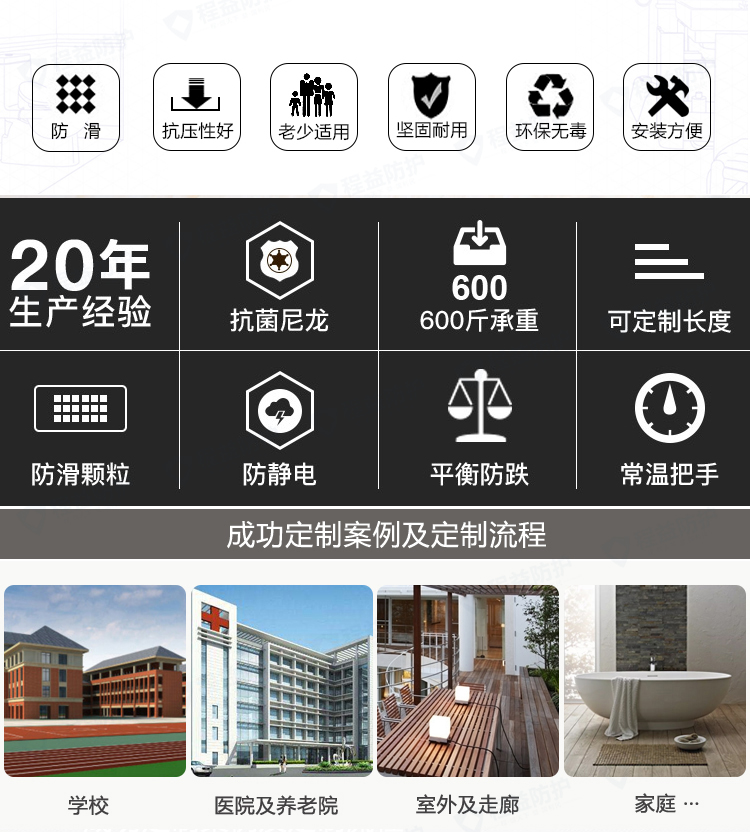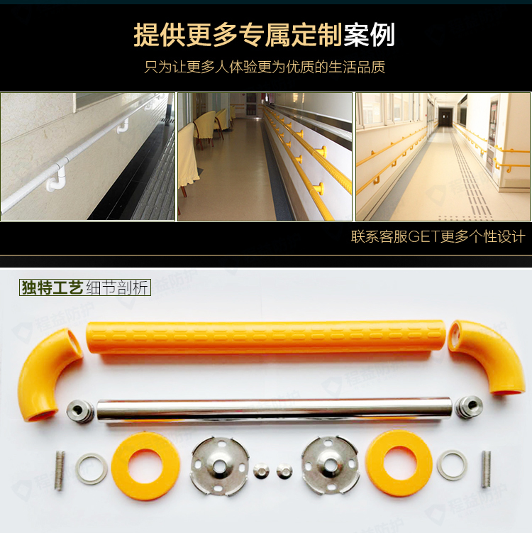 程益防護在2013年開始進行對防撞扶手產(chǎn)品進行技術創(chuàng)新,包括研發(fā)升級140防撞扶手,在生產(chǎn)原料上實現(xiàn)新突破,原生料面板,加厚鋁材,使扶手在承重更強的前提下,顏色變得更加鮮亮,同時面板的柔韌性更強,在此基礎上,公司又研發(fā)了一大系列的159防撞扶手、143防撞扶手、89防撞扶手、圓管639防撞扶手及各類組合扶手為主的防撞扶手系列,以最大化的產(chǎn)品性價比為用戶帶來新體驗、新價值、新收益。截止到2015年底,安 全防護扶手基于“防撞系列”、“無障礙系列”、“醫(yī) 療設備帶系列”、“醫(yī) 療輔材系列”、“防護地材系列”五大產(chǎn)品體系,共涵蓋了 110多個規(guī)格造型的產(chǎn)品及600多種擴展產(chǎn)品。