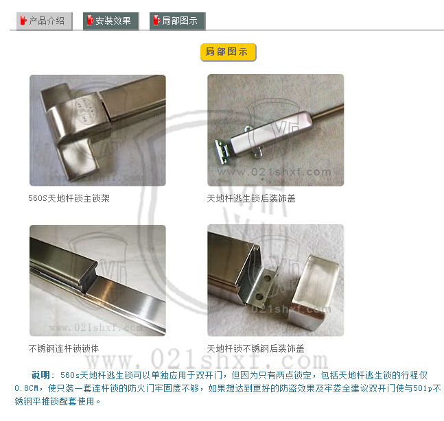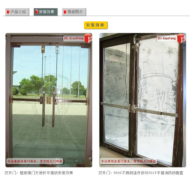 六、相關(guān)產(chǎn)品: 不銹鋼單雙門鎖 無報警烤漆單雙門鎖 天地桿下壓式消防鎖