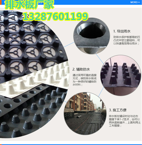 5. 在任何地段鋪設(shè)排水板,必須注意:不要讓泥土、水泥、黃沙【13287601199桑經(jīng)理】等垃圾進(jìn)入排水板的正面空間,確保排水板的空間暢通。