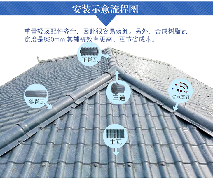 合成樹脂瓦重量及配件品種齊全,因此很容易裝卸;另外,合成樹脂瓦有效寬度為800mm或960mm。瓦鋪裝效更高,更節(jié)省成本。