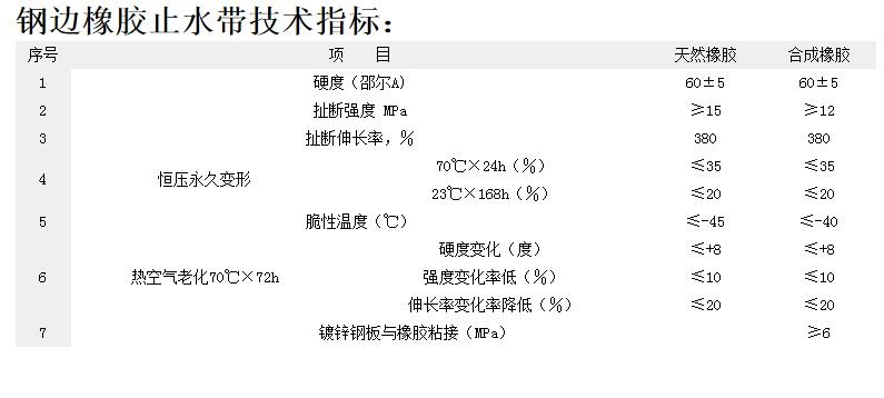 鋼邊止水帶是將熱鍍鋅鋼帶插入硫化橡膠中間是一種新型橡膠止水帶適用于許多大型建筑領(lǐng)域尤其是在水壓高和結(jié)構(gòu)變形量較大時其止水效果更為明顯。普通橡膠止水帶的使用當結(jié)構(gòu)變形大時橡膠止水帶則隨著結(jié)構(gòu)的沉降其橫向截面拉長變薄超過其疲勞變形極限時很可能會形成新的滲漏縫隙。而采用鋼邊橡膠止水帶時兩邊的鋼邊與周圍的混凝土結(jié)構(gòu)的粘接極強同是鋼邊與橡同是鋼邊與橡膠粘接極其牢固。當結(jié)構(gòu)變形時只存在橡膠部分拉長變薄而鋼邊與混凝土、鋼邊與橡膠之間不會產(chǎn)生新的滲漏縫隙因此用鋼邊橡膠止水帶即增強了結(jié)構(gòu)變形時的防滲性能同時對整個工程的防滲止水起到了重要的質(zhì)量保證。