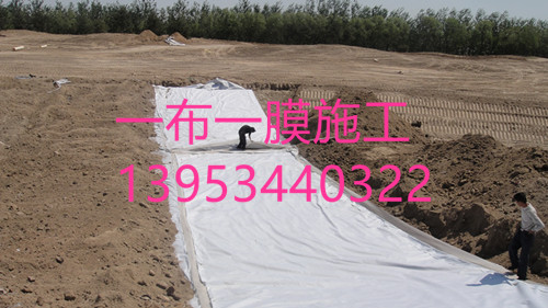 施工中,首先要用料徑較小的砂土或粘土找平基面,然后再鋪設(shè),鋪設(shè)時(shí)不要繃得太緊,兩端埋入土體部分呈波紋狀,最后在所鋪的一布一膜上用細(xì)砂或粘土鋪一層10cm左右過(guò)度層。砌上20-30cm塊石(作防沖保護(hù)層。施工時(shí),應(yīng)盡力避免石塊直接砸在上,是邊鋪膜邊進(jìn)行保護(hù)層的施工。