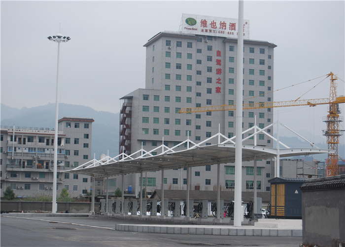 膜結(jié)構(gòu)又叫張拉膜結(jié)構(gòu),膜結(jié)構(gòu)建筑是21世紀(jì)最具代表性與充滿前途的建筑形式。打破了純直線建筑風(fēng)格的模式,以其獨(dú)有的優(yōu)美曲面造型,簡(jiǎn)潔、明快、剛與柔、力與美的完美組合,呈現(xiàn)給人以耳目一新的感覺,同時(shí)給建筑設(shè)計(jì)師提供了更大的想象和創(chuàng)造空間。膜結(jié)構(gòu)是由多種高強(qiáng)薄膜材料(pvc或teflon)及加強(qiáng)構(gòu)件(鋼架、鋼柱或鋼索)通過一定方式使其內(nèi)部產(chǎn)生一定的預(yù)張應(yīng)力以形成某種空間形狀,作為覆蓋結(jié)構(gòu),并能承受一定的外荷載作用的一種空間結(jié)構(gòu)形式。膜結(jié)構(gòu)可分為充氣膜結(jié)構(gòu)和張拉膜結(jié)構(gòu)兩大類。充氣膜結(jié)構(gòu)是靠室內(nèi)不斷充氣,使室內(nèi)外產(chǎn)生一定壓力差(一般在10㎜~30㎜水柱之間),室內(nèi)外的壓力差使屋蓋膜布受到一定的向上的浮力,從而實(shí)現(xiàn)較大的跨度。張拉膜結(jié)構(gòu)則通過柱及鋼架支承或鋼索張拉成型。