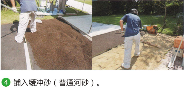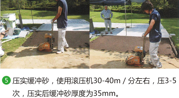 5、壓實緩沖砂,使用滾壓機30-40m/分左右,壓3-5次,壓實后緩沖砂厚度為35mm