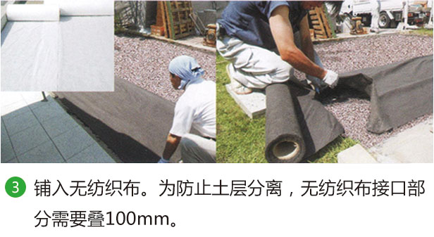 3、鋪入無仿布。為防止土層分離,無紡織布接口部分需重疊100mm
