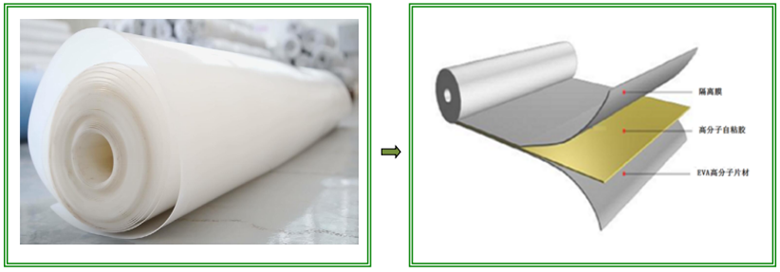 2、eva自粘防水板是由eva合成高分子片材、高分子熱熔膠及隔離膜一次性復(fù)合而成的一種自粘性防水板。