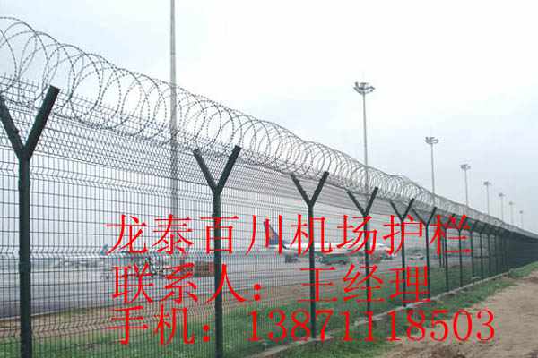 機(jī)場(chǎng)護(hù)欄網(wǎng)又稱(chēng)機(jī)場(chǎng)隔離柵,機(jī)場(chǎng)防護(hù)網(wǎng),機(jī)場(chǎng)鋼網(wǎng)墻機(jī)場(chǎng)防攀網(wǎng),機(jī)場(chǎng)圍墻網(wǎng)等,主要是采用高強(qiáng)度的刀片刺網(wǎng)與普通防護(hù)網(wǎng)的結(jié)合,由v型支架立拄,加強(qiáng)型焊接片網(wǎng),安 全防盜連接件和刀片刺網(wǎng)組成.刀片刺網(wǎng)是一種新型防護(hù)網(wǎng),由銳利尖角鍍鋅鋼板或不銹鋼薄板做刀片,鋼絲做芯線(xiàn)組合而成的防護(hù)器材. 監(jiān)獄防護(hù)網(wǎng)刀片刺網(wǎng)具有嚇阻、防翻越等效果,材質(zhì)堅(jiān)硬,高強(qiáng)度,高張力,造型設(shè)計(jì)獨(dú)特,不宜觸摸,因而能達(dá)到極好的防護(hù)隔離效果.機(jī)場(chǎng)護(hù)欄網(wǎng)還具有施工簡(jiǎn)便,經(jīng)濟(jì)實(shí)用等優(yōu)點(diǎn). 材質(zhì):機(jī)場(chǎng)防護(hù)網(wǎng)選用低碳鋼絲、鋁鎂合金絲 編織及特點(diǎn):編制焊接而成。機(jī)場(chǎng)護(hù)欄網(wǎng)網(wǎng)格結(jié)構(gòu)簡(jiǎn)練、便于運(yùn)輸、安 裝不受地形起伏限制,特別是對(duì)于山地、坡地、多彎地帶適應(yīng)性極強(qiáng)。該產(chǎn)品堅(jiān)固耐用、價(jià)格中等偏低,適合大面積采用。 機(jī)場(chǎng)護(hù)欄網(wǎng)規(guī)格: 1.立柱:50mm x 100mm x 3mm 表面為熱鍍鋅后浸塑。 2.鋼網(wǎng)邊框:35mm x 35mm x 3mm 表面為熱鍍鋅后浸塑。 3.鋼網(wǎng): 20mm x 70mm x 4mm 表面為熱鍍鋅后靜電噴塑。 產(chǎn)品特點(diǎn):機(jī)場(chǎng)防護(hù)網(wǎng)具有防腐、防老化、抗曬、耐候等特點(diǎn)。螺旋型交叉刀片刺網(wǎng)是在兩條刀片刺網(wǎng)之間以不銹鋼片和鍍鋅鋼片強(qiáng)力夾扣,展開(kāi)后即呈交叉狀,美觀又實(shí)用。 監(jiān)獄護(hù)欄網(wǎng)防腐形式:電鍍、熱鍍、噴塑、浸塑。 主要用途:機(jī)場(chǎng)圍墻加固 、私人高檔會(huì)所圍界網(wǎng)、軍事重地隔離網(wǎng)、 看守所外圍防護(hù)網(wǎng)、 開(kāi)發(fā)區(qū)隔離網(wǎng)、戒毒所防爬網(wǎng)等使用.