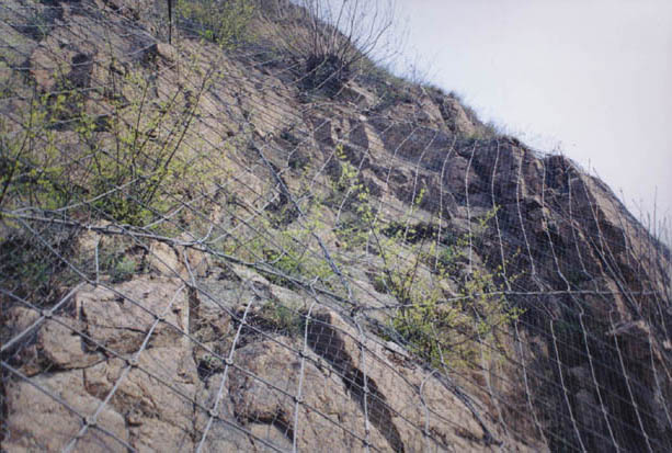 gar2(普通型) 鋼絲繩網(wǎng) 系統(tǒng)鋼絲繩錨桿+支撐繩+縫合繩,孔口凹坑+張拉[或邊沿(上沿)錨固(鋼索錨桿2-4 m 距4.5m)+縱橫向支撐繩(2-∮16)+鋼絲繩網(wǎng)(◇08/300/4*4㎡)+縫合繩(∮8)] 坡面加固,仰制崩塌和風(fēng)化剝落、的發(fā)生,限制局部或少量落石運(yùn)動范圍