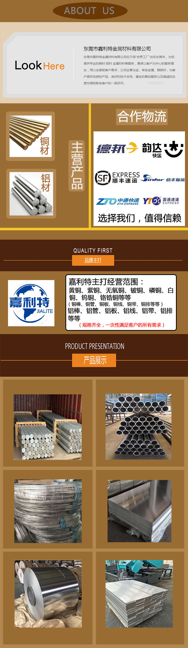 東莞市嘉利特金屬材料有限公司是一家集鋁及鋁合金生產(chǎn)經(jīng)營(yíng)于一體的綜合性企業(yè),主要產(chǎn)品有鋁及鋁合金板、鋁卷、鋁帶、鋁箔、鋁棒、鋁管、鋁線、鋁排等產(chǎn)品都經(jīng)過(guò)2003版iso9001質(zhì)量體系認(rèn)證。