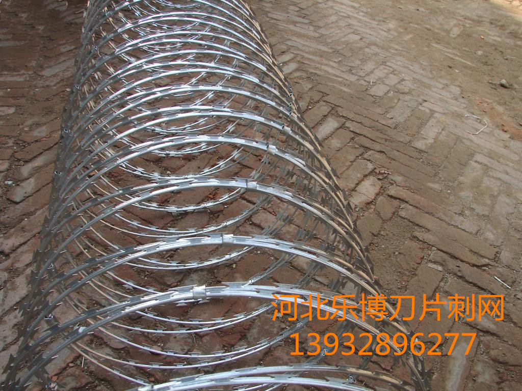 刀片刺絲又名刮刀型刺絲,是一種近年發(fā)展起來(lái)的防護(hù)、隔離能力較強(qiáng)的新型防護(hù)網(wǎng)產(chǎn)品。它采用鋼板沖壓成型包附于鋼絲(筋絲)之上,由銳利尖角鍍鋅鋼板或不銹鋼薄板做刀片,高張力鋼絲做芯線組合而成的。鋒利的刀型刺由雙線扣裝后成蛇腹?fàn)?既美觀又讓人不寒而粟。起到了很好的阻嚇作用。該產(chǎn)品具有美觀、防阻效果好、施工便利等優(yōu)點(diǎn)。世界各國(guó)已將刀片刺網(wǎng)廣泛用于軍事重地、監(jiān)獄、政府機(jī)關(guān)、銀行,以及生活小區(qū)圍墻、私人住宅、別墅的圍墻、門(mén)窗、高速公路、鐵路護(hù)欄以及邊境線等用來(lái)防護(hù)保安 。