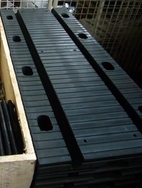 板式橡膠伸縮裝置中的伸縮體是由橡膠、鋼板或角鋼硫化為一體的構(gòu)造,它是利用橡膠材料剪切模量低的原理設(shè)計(jì)制造而成。即剪切型橡膠伸縮體設(shè)有上下凹槽,橡膠體內(nèi)埋設(shè)承重鋼板和錨固鋼板,并設(shè)有預(yù)留螺栓孔,通過(guò)螺栓與梁端連成整體。它是依靠上下凹槽之間的橡膠體剪切變形來(lái)滿足梁體結(jié)構(gòu)的相對(duì)位移。橡膠伸縮體內(nèi)預(yù)埋鋼板,跨越梁端間隙,承受車輛荷載。