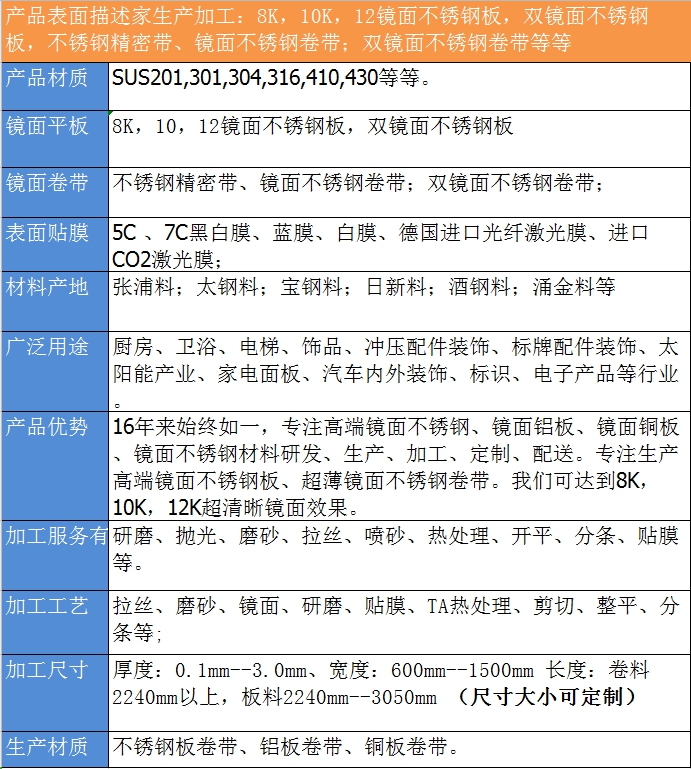 產品表面描述:8k鏡面定義:不銹鋼表面經過研磨拋光,表面光亮如鏡,照物映人,俗稱鏡面8k,且鏡面板材是加工后續(xù)彩色或蝕刻板材的基板。主要應用于各類裝潢或金屬光學產品用途。