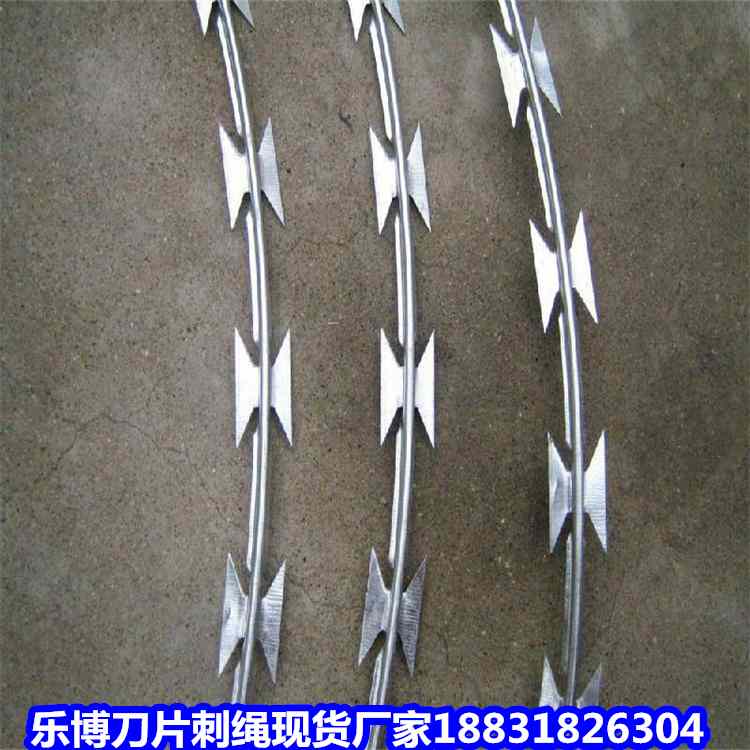 刀片刺繩也稱為刀片刺絲、刀片刺網(wǎng),是一種新型護(hù)欄網(wǎng)產(chǎn)品。它具有嚇阻效果好、美觀、施工便利,經(jīng)濟(jì)實(shí)用等優(yōu)異特點(diǎn)。主要用于園林公寓,機(jī)關(guān)單位,監(jiān)獄,哨所,邊防等的圈禁防護(hù)。刀片刺網(wǎng)由熱鍍鋅鋼板或不銹鋼薄板沖壓出尖銳的刀片狀,高張力鍍鋅鋼絲或者不銹鋼絲做芯線組合而成的阻絕器材。由于刺網(wǎng)造形獨(dú)特不易觸摸,因而能達(dá)到極好的防護(hù)隔離效果。產(chǎn)品的主要材質(zhì)有鍍鋅板和不銹鋼板。