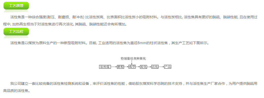 脫硫脫硝用活性焦工藝原理 活性焦是一種綜合強(qiáng)度(耐壓、耐磨損、耐沖擊) 比活性炭高、比表面積比活性炭小的吸附材料。與活性炭相比, 活性焦具有更好的脫硫、脫硝性能, 且在使用過程中, 加熱再生相當(dāng)于對(duì)活性焦進(jìn)行再次活化, 其脫硫、脫硝性能還會(huì)有所增加。工藝流程 活性焦是以煤炭為原料生產(chǎn)的一種新型吸附材料。目前, 工業(yè)適用的活性焦為直徑8mm的柱狀活性焦,其生產(chǎn)工藝如下圖所示。