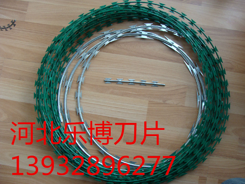 工藝:采用鋼板(刀板)沖壓成型包附于熱鍍鋅鋼絲(芯線(xiàn))之上,由銳利尖角鍍鋅鋼板或 不銹鋼薄板做刀片,高張力鋼絲做芯線(xiàn)組合而成的。