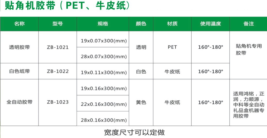貼角機(jī)膠帶用于各類(lèi)印刷包裝行業(yè)的高檔禮品盒四角定位。還適用于東莞鴻銘機(jī)械、力順源機(jī)械廠,鑫春源,金格,欣煒,正潤(rùn),溫州中科機(jī)械,廣雄,聯(lián)興,正潤(rùn)機(jī)械等機(jī)械廠的半自動(dòng)貼角機(jī)和全自動(dòng)天地蓋禮盒機(jī)上。