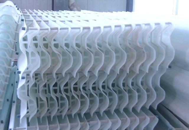 本產(chǎn)品葉片采用最新復(fù)合材料制作而成的,高強(qiáng)度、耐酸 、耐堿 、耐高濃度氯 離子、耐磨、表面光滑等優(yōu)點。并能在150℃煙氣溫度工況下連續(xù)使用,當(dāng)脫硫除塵系統(tǒng)出現(xiàn)故障,如雙堿 法或其他脫硫工藝管道出現(xiàn)結(jié)垢或是循環(huán)泵出現(xiàn)故障,使吸收塔內(nèi)的煙氣溫度急速升高,如采用pp(聚丙稀)除霧器就會出現(xiàn)整體或者局部坍塌,本產(chǎn)品最大能承受150℃煙氣溫度連續(xù)使用,即使脫硫系統(tǒng)出現(xiàn)故障煙氣溫度升高,本產(chǎn)品除霧器也能正常使用,不會影響整個脫硫系統(tǒng)正常運(yùn)行。
