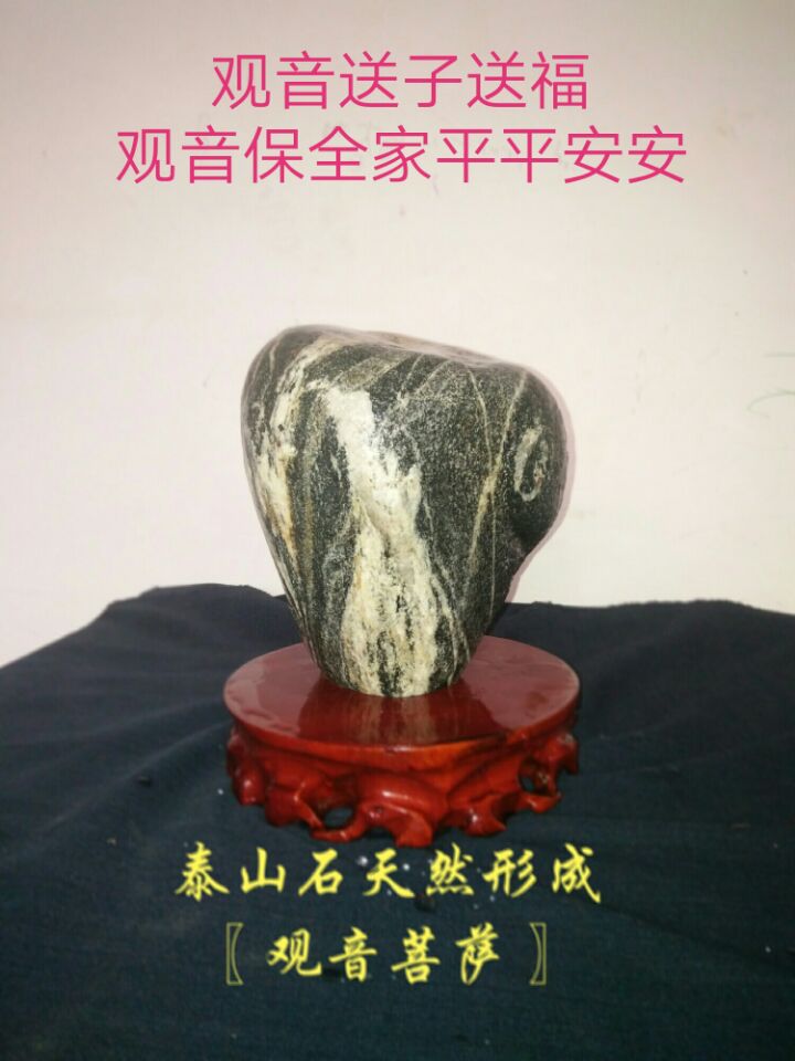 辨吉兇。泰山在東方,屬春,為青帝神的化身,是五岳之宗,降吉賜福之地!妒酚洝吩疲骸白怨攀苊弁蹶聡L不封禪”,“古者封泰山者七十二家”。秦、漢、唐、宋歷代皇帝封泰山求國泰民安 的聲勢均非常之大。老百姓登泰山朝圣求平安 者更是數(shù)不勝數(shù)。人們篤信泰山是神山,泰山石是神石。 泰山奇石頭(觀音菩薩)天然紋理高26寬15重18.8斤