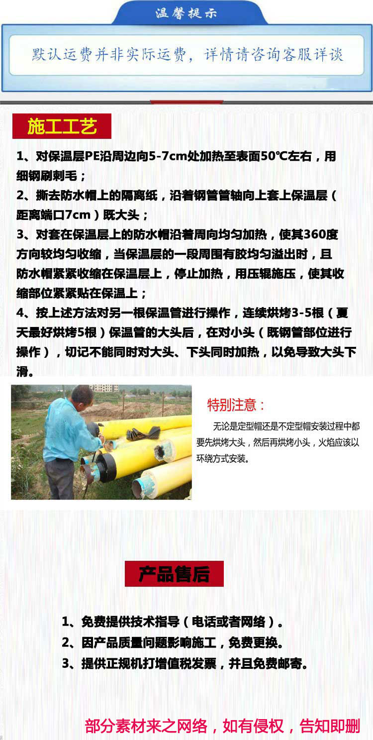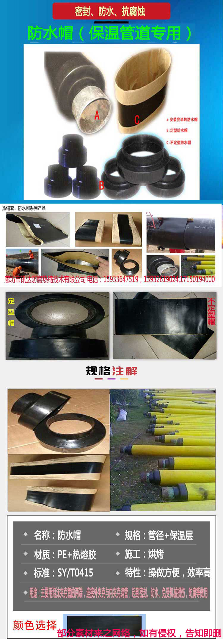 熱縮防水帽主要用于具有泡沫夾克管的兩端,連接外夾克與內(nèi)夾克鋼管,起到密封、防水、免受機械損傷,防腐等做用。