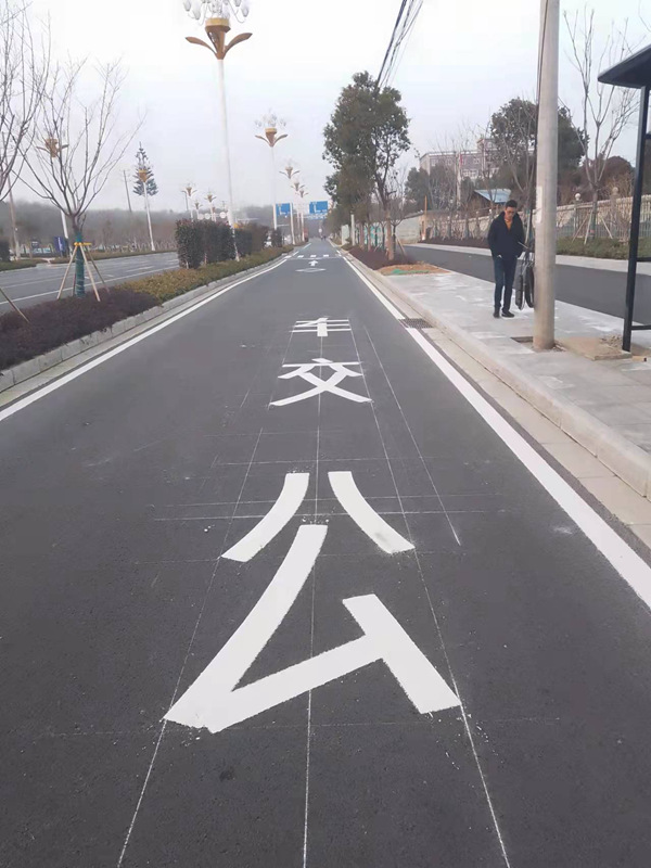 二、鋪設(shè)彩色防滑路面,公交道和公交站臺(tái)上車(chē)位劃線內(nèi)施劃有“公交”文字和公交車(chē)型圖案,前后有斜杠標(biāo)線,同樣代表著禁止?。