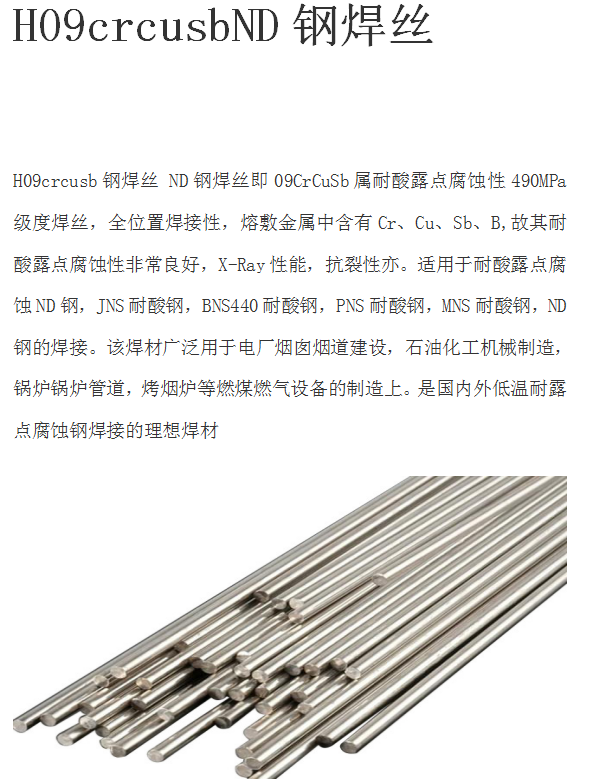H09crcuab鋼焊絲 ND鋼焊絲即 09CrCuSb屬耐酸露點腐蝕性 490MPa 級度焊絲,全位置焊接性,熔敷金屬中含有Cr、Cu、Sb、B,故其耐酸露點腐蝕性非常良好,X-Ray性能,抗裂性亦。適用于耐酸露點腐蝕ND鋼,JNS耐酸鋼,BNS440耐酸鋼,PNS耐酸鋼,MNS耐酸鋼,ND 鋼的焊接。該焊材廣泛用于電廠煙囪煙道建設(shè),石油化工機械制造,鍋爐鍋爐管道,烤煙爐等燃煤燃氣設(shè)備的制造上。是國內(nèi)外低溫耐露點腐蝕鋼焊接的理想焊材