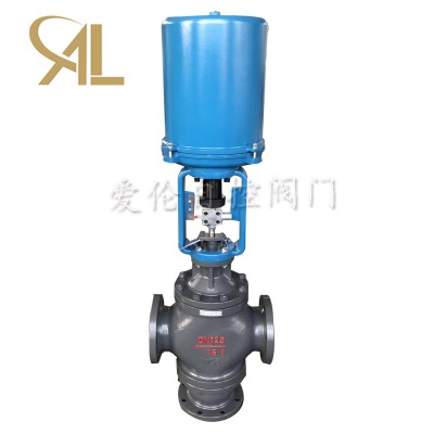 電動三通調(diào)節(jié)閥概述電子式電動三通調(diào)節(jié)閥是由3610l列電子式電動執(zhí)行機(jī)構(gòu)與三通調(diào)節(jié)機(jī)構(gòu)組成。電動執(zhí)行機(jī)構(gòu)內(nèi)有伺服系統(tǒng),無需另配伺服放大器,有播入信號及電 源可控制運(yùn)轉(zhuǎn),接線簡單。調(diào)節(jié)機(jī)構(gòu)有合流和分流兩種作用方式,在某些場合可以替代兩個二通閥和一個三通接管而得到廣泛應(yīng)用。常用于熱交換器的兩相調(diào)節(jié)及簡單的配比調(diào)節(jié)。