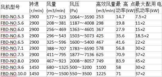 fbd礦用隔爆壓入式對旋軸流局部通風機參數表(僅供參考)