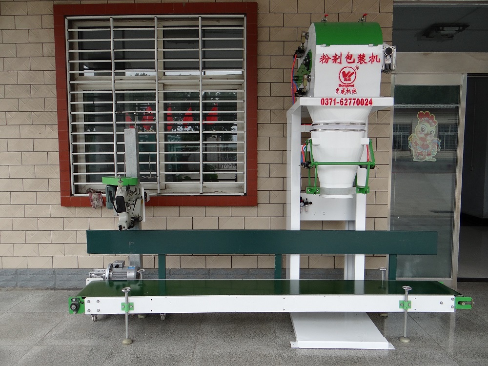 該包裝秤專為淀粉 、面粉 、化工、肥料、bb肥、種子大米、糧食等流動性較好的粉 料物料和顆粒物料的定量包裝而設(shè)計,粉 劑 的采用有大小螺桿式給料,顆粒的采用自流加震動式兩種結(jié)構(gòu)通過變頻器讓螺桿推進(jìn)器進(jìn)入緩沖料倉,物料通過變頻控制的給料螺桿送到袋內(nèi),顆粒通過自流門大小調(diào)節(jié)和慢下震動一級方式來控制。粉 劑 的通過控制螺桿的轉(zhuǎn)速頻率控制給料量,料袋一旦到秤裝滿,其夾袋器通過控制系統(tǒng)打開,料袋通過輸送帶送走,由人工輔助封口。