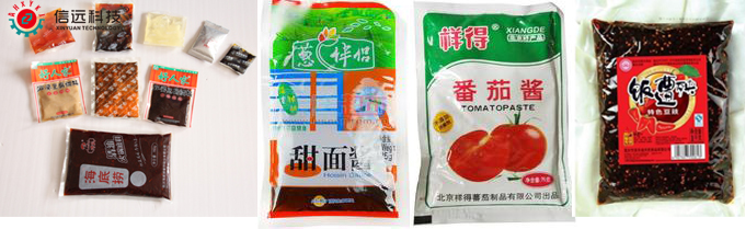 醬料調(diào)味料小袋自動包裝機械、袋裝醬料包裝機適用于各類醬體、醬料、調(diào)味料、油料等全自動計量包裝封口,可自動完成定量灌裝、折邊制袋、包裝封口、打印批號、生產(chǎn)日期、加易撕口、切斷或聯(lián)體袋、產(chǎn)品計數(shù)等整套自動包裝流程;采用氣動柱塞泵容積法計量方式,特別適用于封口包裝易拉絲及滴漏的產(chǎn)品物料;該包裝機可以包裝500克至10公斤范圍物料。袋長可以任調(diào),當要包裝多種包裝規(guī)格,袋寬不定時,可以根據(jù)袋子的包裝規(guī)格及重量,購置多套不同包裝規(guī)格的成型器,配合不同的物料輸送泵。能夠?qū)崿F(xiàn)物體在高溫狀態(tài)下的自動定量充填包裝,能有效的提高生產(chǎn)效率,避免因細菌入侵而造成的二次污染。該包裝生產(chǎn)設備凝聚我公司多年來在自動包裝行業(yè)的成功技術經(jīng)驗,汲取大量用戶的寶貴意見建議,不斷完善更新并批量生產(chǎn)達到國內(nèi)先進水平的全自動醬料包裝生產(chǎn)設備。該機具有計量精度高,包裝速度快,無封口污染、防物料灌裝拉絲滴漏、袋型美觀等特點。
