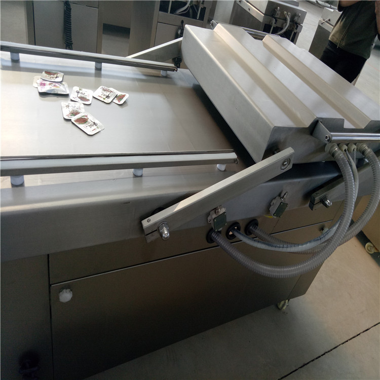 諸城榮品600/2s熟食鹵制品雙室真空包裝機是利用一個真空蓋在兩個真空室上相互交替工作,從而達到提高工作效率的目的,當一個真空室在抽真空時,另一個真空室可以擺放包裝物;真空蓋擺動設(shè)計了省力裝置,大幅度降低了操作人員的勞動強度。