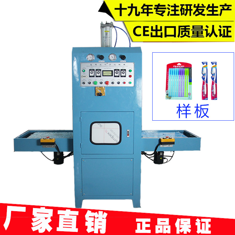 文具泡殼紙卡包裝機器振蕩頻率符合國際工業(yè)波段標準,由高q值真空電子管自激振蕩器產(chǎn)生高頻電磁場,使加工塑膠在上下電極間的高頻電場內,使其分子產(chǎn)生劇烈運動摩擦,在模具的壓力下得到其熔接效果。文具泡殼紙卡包裝機器采用h型龍門結構,左右雙向滑臺,往返連續(xù)推送模具,運行高效。