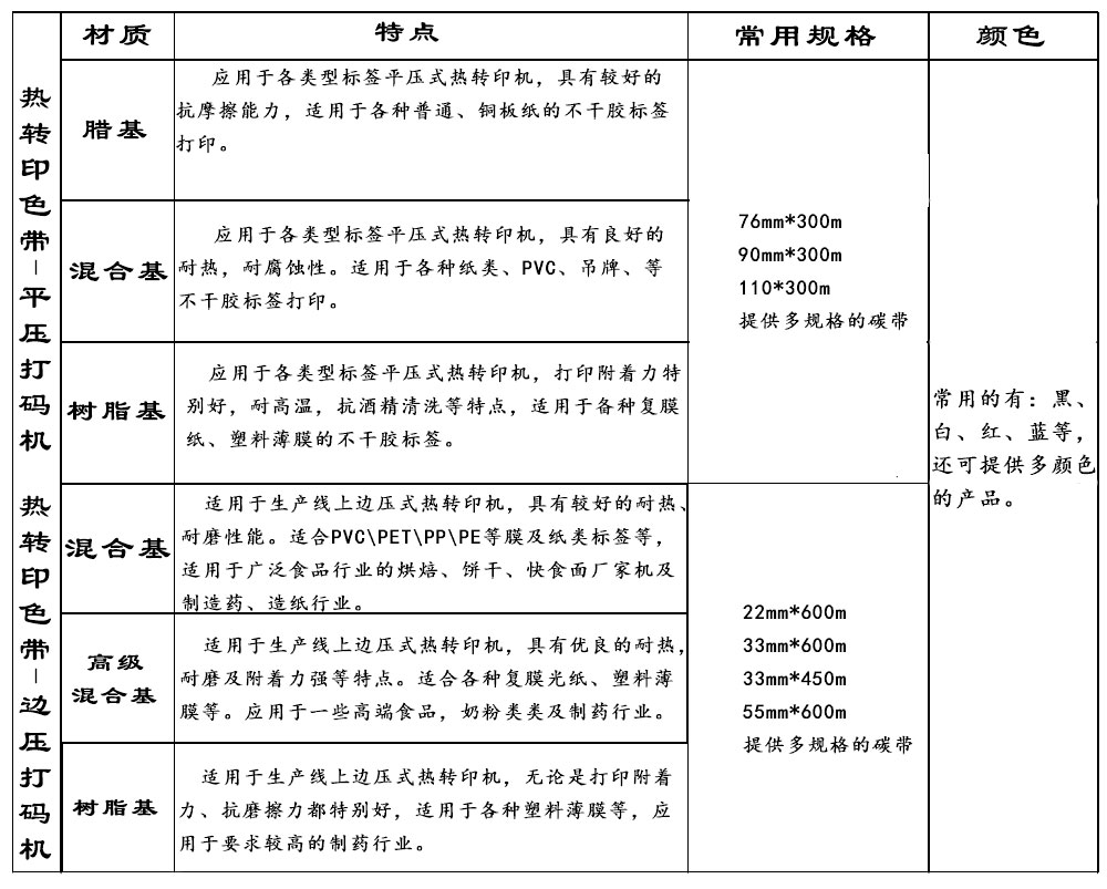 1. 混合基 適用于生產(chǎn)線上邊壓式熱轉(zhuǎn)印機(jī),具有較好的耐熱、耐磨性能。適合pvc\pet\pp\pe等膜及紙類標(biāo)簽 。廣泛適用于食品行業(yè)的烘焙、餅干、快食面廠家及制藥、造紙行業(yè)。