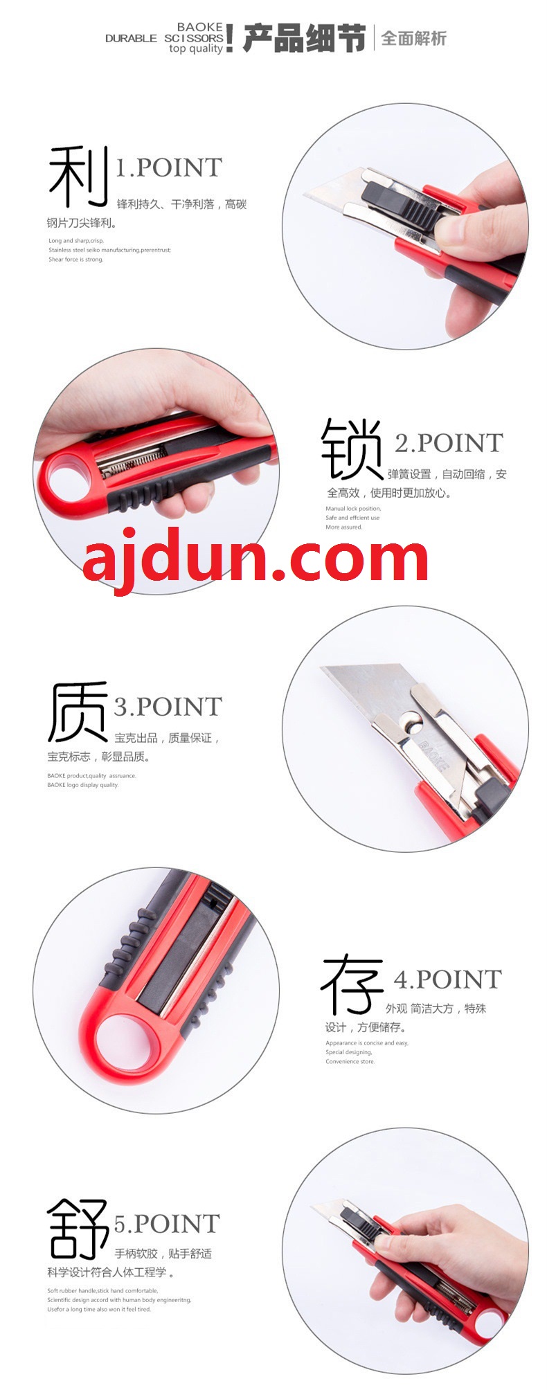 2.在不使用時(shí)安 全刀的刀片隱藏在刀具內(nèi)部,以避免傷及使用人員安 全