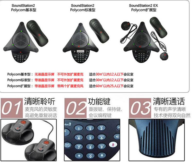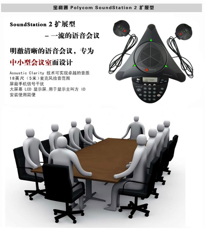 寶利通soundstation 2 擴展型適合40到60平米的中小型會議室環(huán)境,360度全向麥 克風,不用大家再擠在一起說話,使得開會更輕松。易于安 裝使用,不改變原有溝通的使用習慣。更加高效的電話