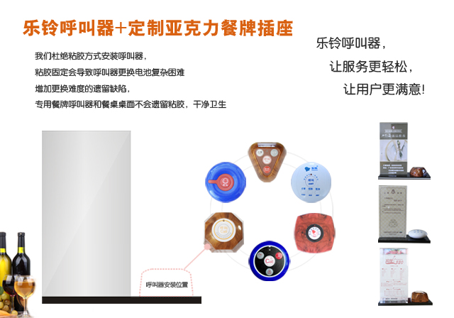 樂鈴呼叫器,讓服務更輕松,讓用戶更滿意,可自定義中文房號,包房名稱,呼叫內(nèi)容,可播報中文語音房號,hb009多鍵呼叫器,呼叫器+亞克力餐牌插座,支持方案定制開發(fā)。