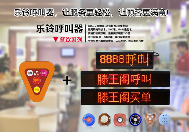 樂(lè)鈴呼叫器,讓服務(wù)更輕松,讓用戶(hù)更滿(mǎn)意,可自定義中文房號(hào),包房名稱(chēng),呼叫內(nèi)容,可播報(bào)中文語(yǔ)音房號(hào),樂(lè)鈴無(wú)線呼叫器-hb100呼叫器,推薦使用:酒店,餐廳、茶樓、咖 啡 廳等,呼叫器+亞克力餐牌插座,支持方案定制。
