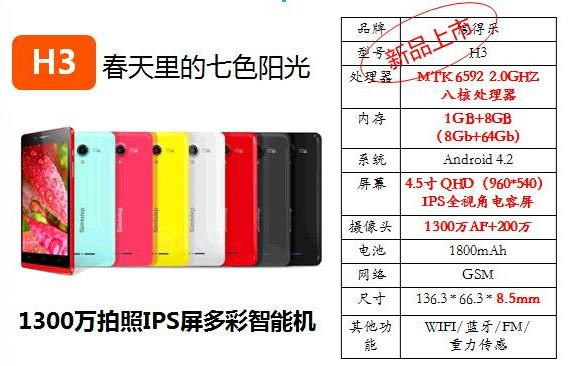 h3采用了4.5英寸的ips全視角屏,mtk八核主板,大內(nèi)存1gb+8gb配置,安卓4.2.2系統(tǒng)讓用戶體驗(yàn)極速享受,娛樂無限;配置1300萬攝像頭,拍攝效果極佳,完全可以媲美中高端數(shù)碼相機(jī)。身材,機(jī)身厚度僅有8.5mm,不僅僅帶來更好的手感和視覺效果,也是更領(lǐng)先科技的體現(xiàn)!