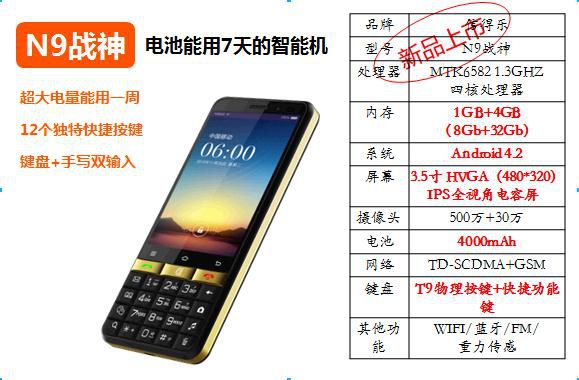 n9戰(zhàn)神史上最好用的智能機,為商務人士量身定做,獻給父母最好的禮物,北方冬天專用神機。4000mah,智能機也能用一周,qq微信等多個功能快捷按鍵,電容手寫+物理鍵盤雙輸入,四核處理器、大內存,配置主流,采用ips全視角屏,物超所值,支持wcdma網絡,速度更快,還是雙卡雙待哦!