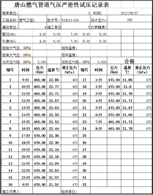 采用壓力帶溫度補(bǔ)償功能的記錄儀, 按照設(shè)定間隔將數(shù)據(jù)記錄下來(lái), 依據(jù)《城鎮(zhèn)燃?xì)廨斉涔こ淌┕ぜ膀?yàn)收規(guī)范( 附條文說(shuō)明) 》給定的評(píng)判標(biāo)準(zhǔn), 滿足了管道氣密性檢測(cè)的標(biāo)準(zhǔn);這樣, 人工測(cè)試的不利因素 得到了避免, 作業(yè)簡(jiǎn)單, 節(jié)省人力。