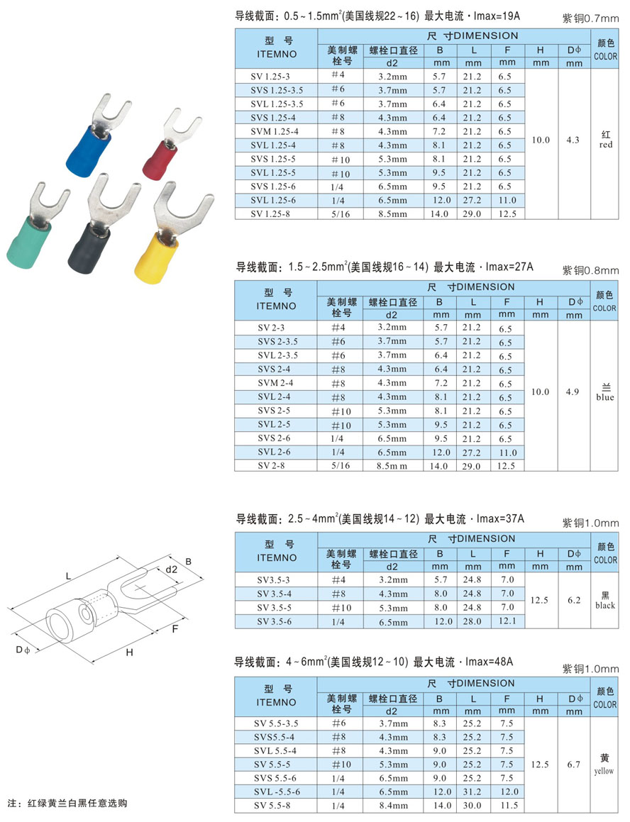 叉形預(yù)絕緣端子,叉口線耳鼻子,本系列預(yù)絕緣端頭適用于連接導(dǎo)線為0.5-6平方毫米范圍,交流額定工作頻率為50hz,額定電壓為600v,