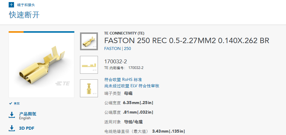 端子和接頭快速斷開連接器泰科料號170032-2電氣特性